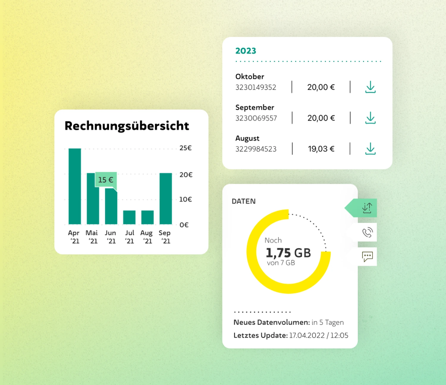 Optionen, Datenvolumen, Rechnungen; aufbereitet so, dass jeder sofort versteht, was Sache ist.
